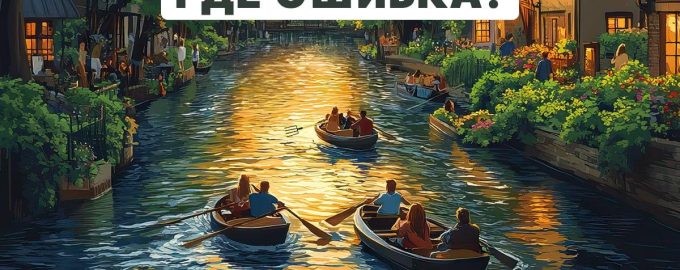 Foran dig er der et billede, som viser et smukt landskab i en aftenby. Der løber en flod mellem husene, som folk i både flyder på. Ved første øjekast virker billedet normalt, men faktisk er der en grov fejl i det.